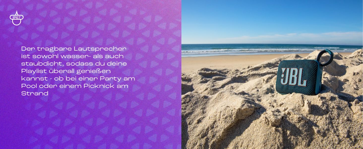 Die Soundbox ist gemäß IP67 wasserdicht, staubfest und wird mit der Schlaufe zum idealen Begleiter bei der nächsten Poolparty - für unbeschwerten Musikgenuss, egal ob am Pool, am Strand oder im eigenen Garten