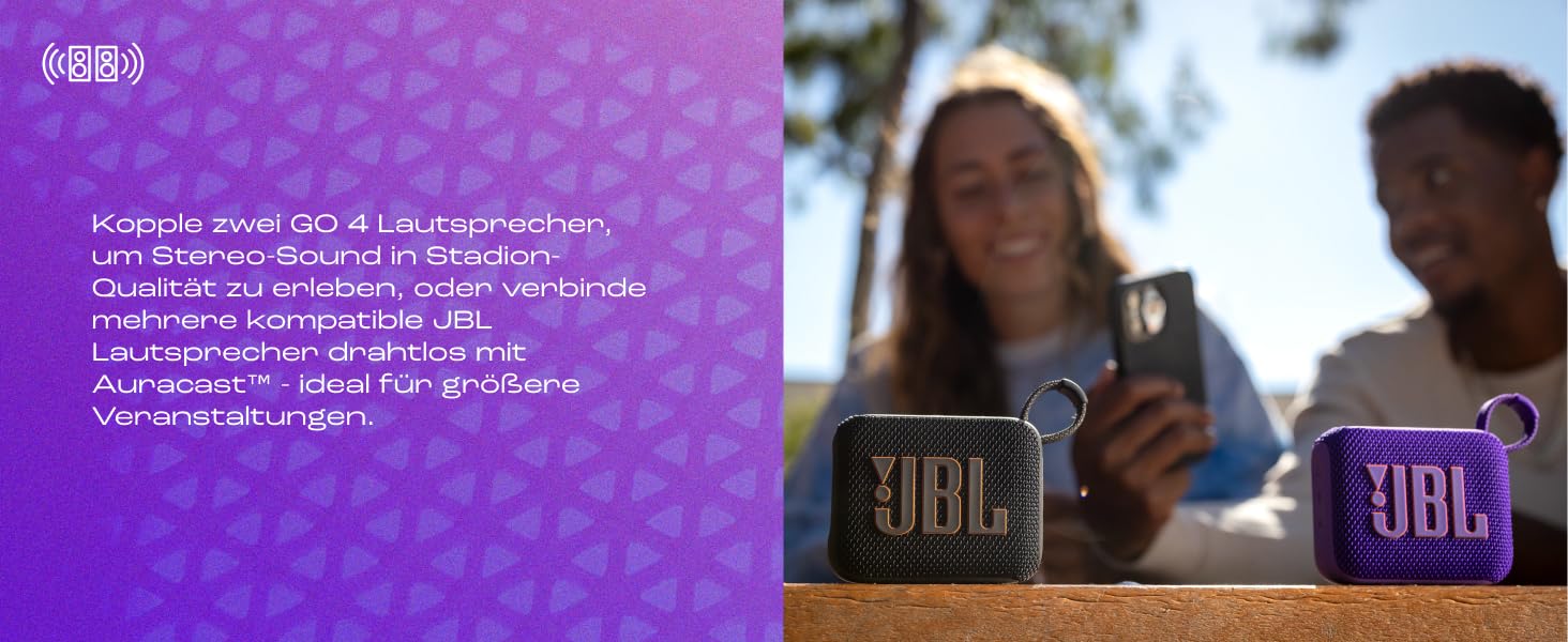 Für eindrucksvollen Stereo-Sound können zwei Go 4 Lautsprecher miteinander gekoppelt werden / Um das Party-Setup zu erweitern, lassen sich mehrere JBL Lautsprecher mit Auracast kabellos verbinden