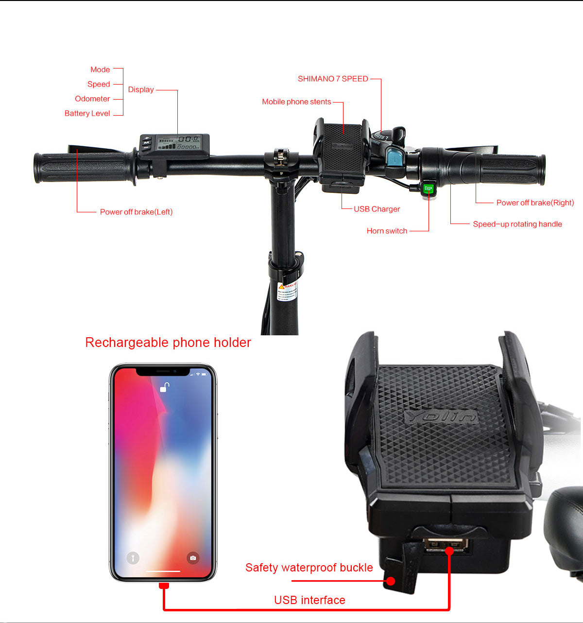 Bleiben Sie informiert und behalten Sie die Kontrolle mit dem Display. Verfolgen Sie Ihre Geschwindigkeit, überwachen Sie den Batteriestand, wechseln Sie mühelos die Gänge und behalten Sie Ihre Gesamt- und Einzelfahrstrecken im Auge, während Sie unterwegs bequem Ihr Telefon aufladen!