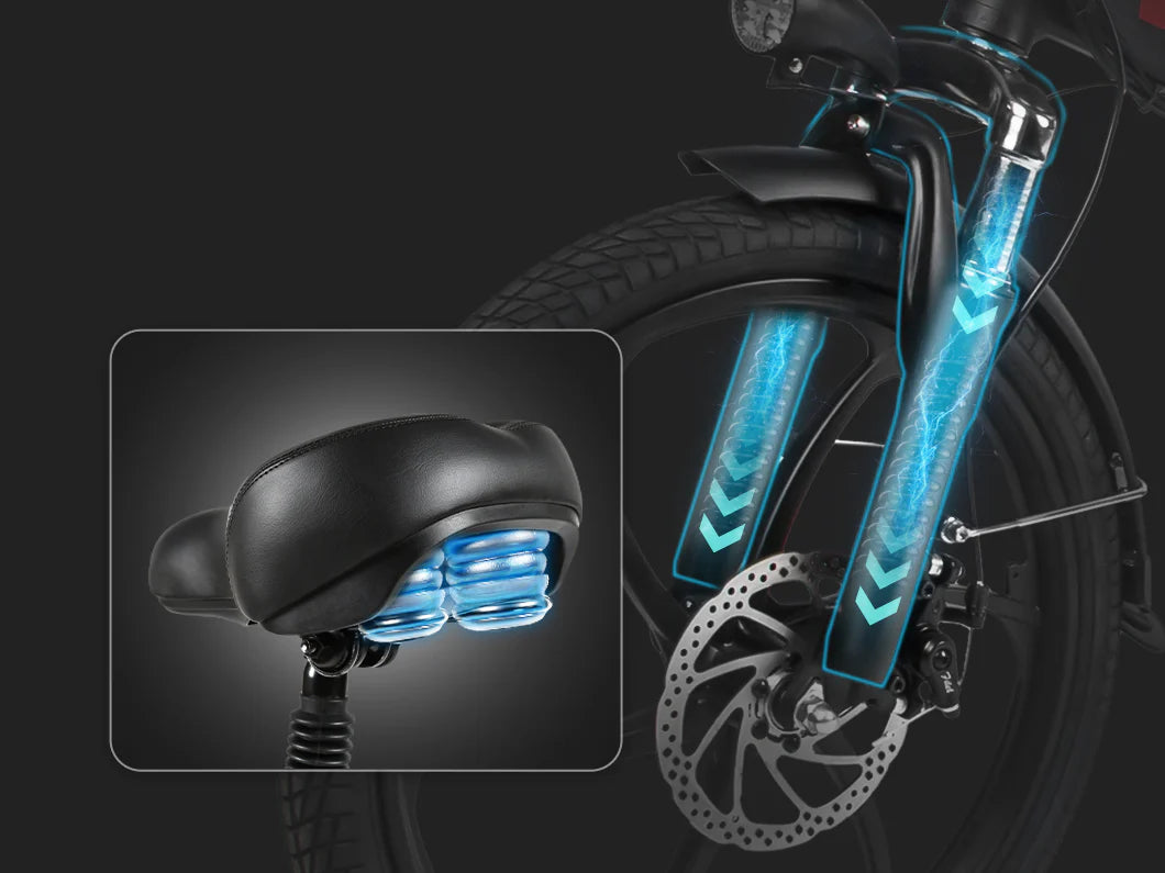 Ausgestattet mit einem Stoßdämpfer an der Vordergabel und einer Sitzfeder sorgt das doppelte Stoßdämpfungssystem für eine sanfte und stabile Fahrt!