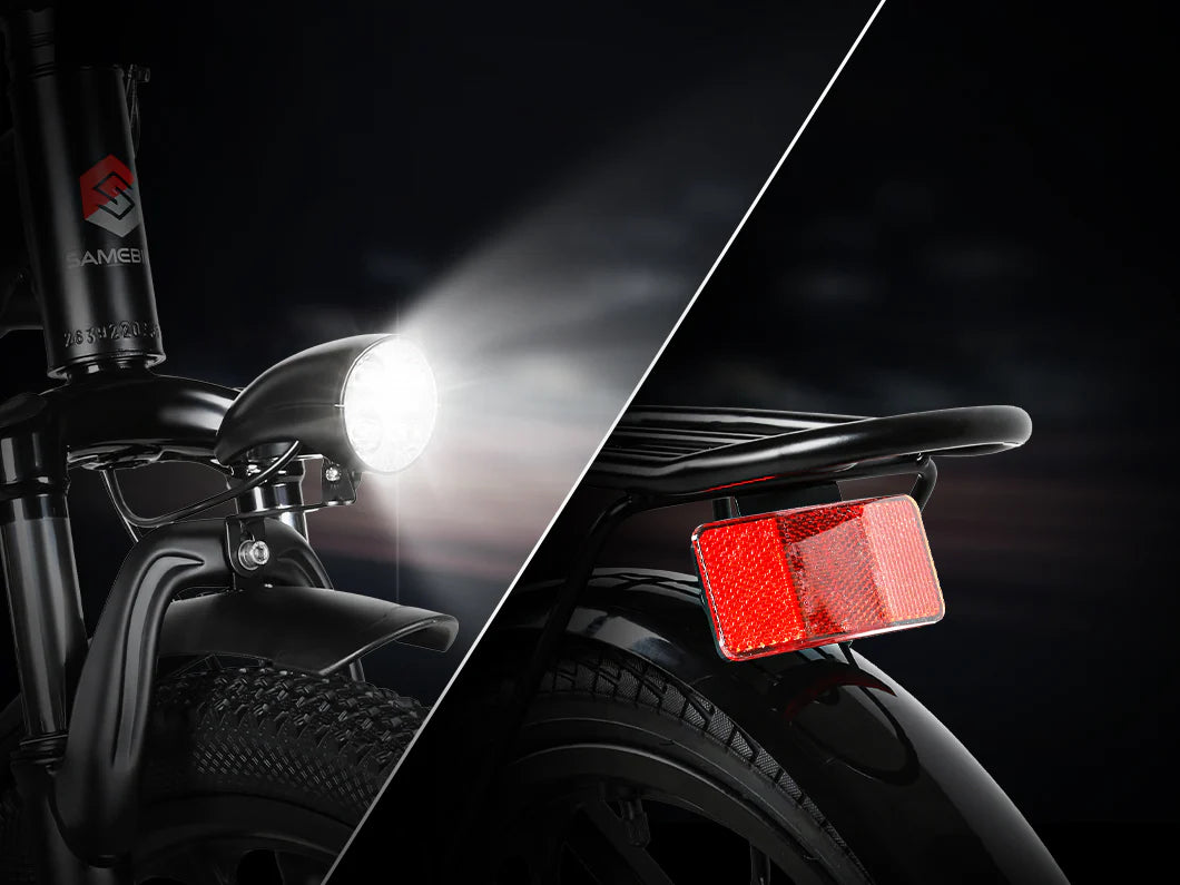 Ausgestattet mit Scheinwerfern und reflektierenden Rücklichtern macht es das Fahren bei besonderem Wetter und nachts sicherer.