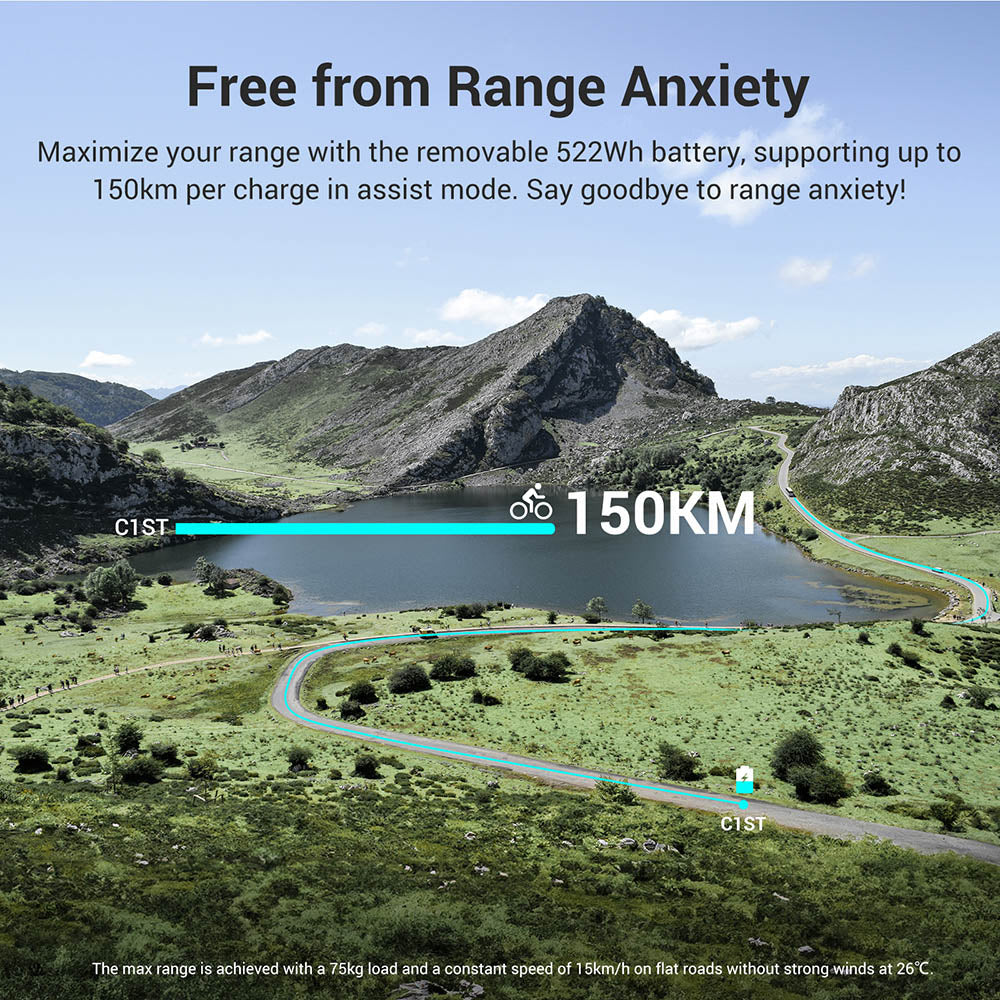 Maximize your range with the removable 522Wh battery, supporting up to 150km per Aufladung im Assist-Modus. Say goodbye to range anxiety!