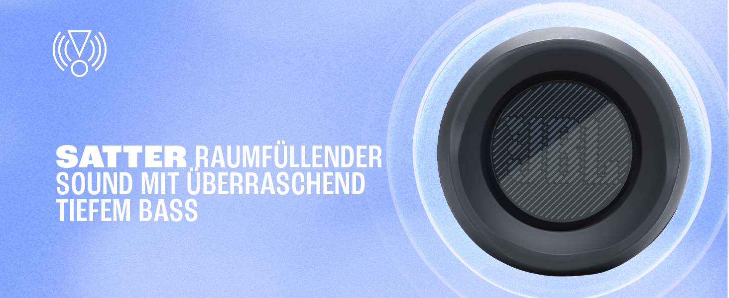 Raumfüllender Stereoklang dank des rennstreckenförmigen Treibers der Flip Essential 2, der in einem so kompakten Design überraschend tiefe Bässe liefert