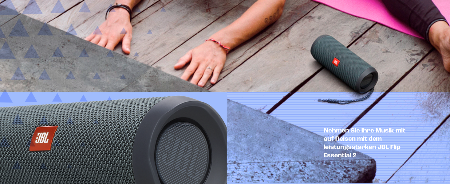 1 x JBL Flip Essential 2 wasserdichter, leistungsstarker Lautsprecher, 1 x USB-Kabel Typ C, 1 x Schnellstartanleitung, 1 x Sicherheitsdatenblatt