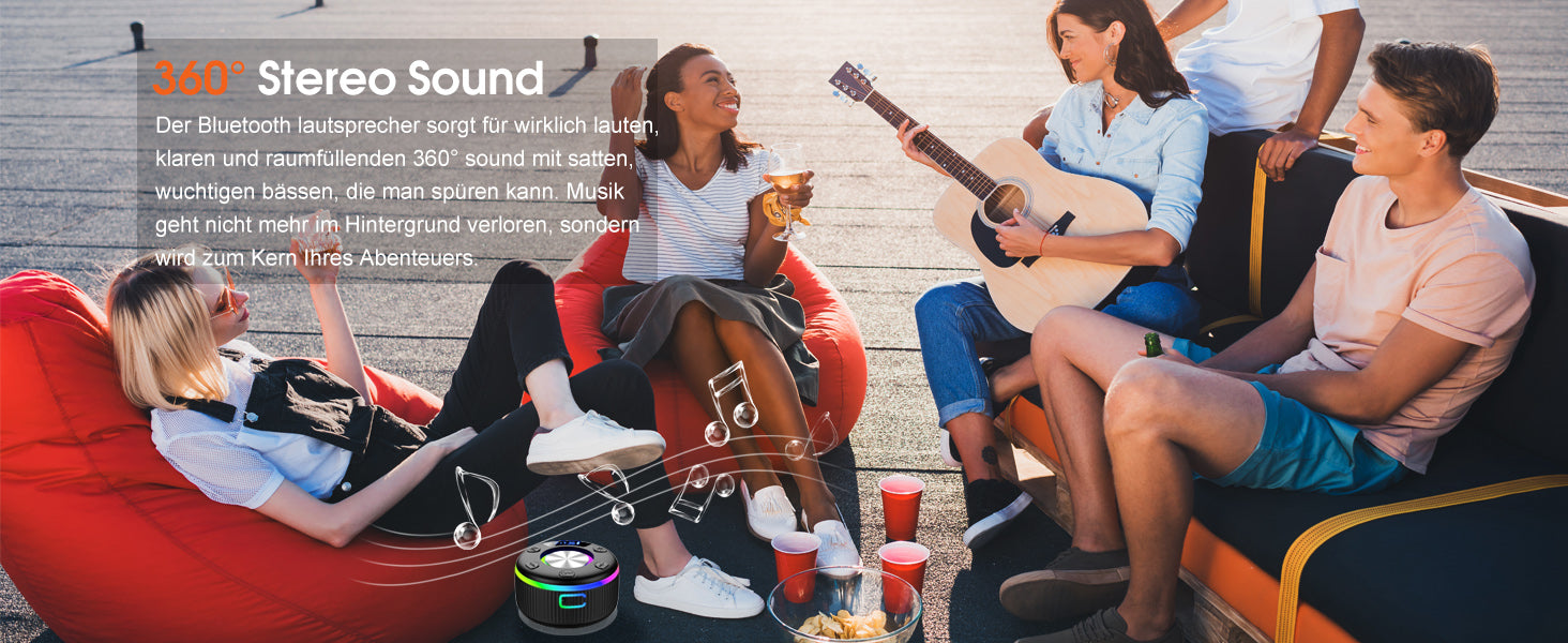 Der tragbare Bluetooth-Lautsprecher bietet einen 360°-Sound mit Tiefen, der jede einzelne Note klar hervorhebt. Alle Klänge aus dem Lautsprecher sind knackig, natürlich und realistisch, ganz ohne Verzerrungen. Für ein noch intensiveres Hörerlebnis können Sie zwei Lautsprecher miteinander verbinden, um raumfüllenden Stereoklang und 3D Stereo Surround Sound zu erzielen. Genießen Sie Ihre Lieblingsmusik überall in noch nie dagewesener Klarheit!