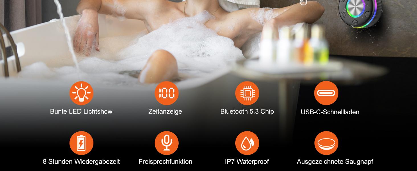 Mit seiner IP7-Zertifizierung ist der Lautsprecher stoßfest, staubdicht und wasserdicht – perfekt für Musikgenuss im Schwimmbad, Badezimmer und anderen feuchten Umgebungen. Der abnehmbare Saugnapf ermöglicht eine einfache Befestigung an Badezimmerfliesen und Spiegeln. So können Sie Ihre Entspannungsmomente mit Ihrer Lieblingsmusik genießen, ohne sich Sorgen um Wasserschäden machen zu müssen.