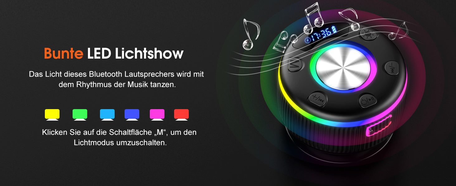 PRSCFUM Bluetooth Lautsprecher – IPX7 Wasserdicht, Bluetooth 5.3, Mit Licht & Saugnapf, Für Badezimmer, Party & Reisen