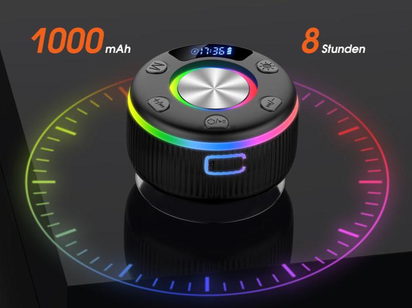 Die Lichter dieses Duschlautsprechers tanzen im Rhythmus Ihrer Musik. Die farbenfrohen Lichter blinken synchron zum Beat und schaffen eine pulsierende Lichtshow für jeden Song, die sowohl das Auge als auch das Ohr erfreut. Dank des eingebauten 1000-mAh-Akkus genießen Sie bis zu 8 Stunden ununterbrochene Musikwiedergabe bei 40% Lautstärke nach nur 1,5 Stunden Ladezeit. Ideal, um mit Freunden zu feiern!