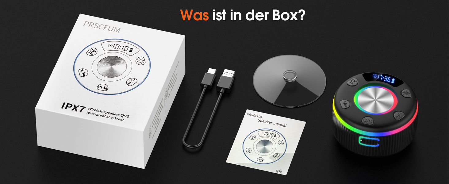 1 * Leistungsstarker Saugnapf, 1 * Schnellladekabel, 1 * Badezimmerlautsprecher, 1 * Benutzerhandbuch1 * Leistungsstarker Saugnapf, 1 * Schnellladekabel, 1 * Badezimmerlautsprecher, 1 * Benutzerhandbuch