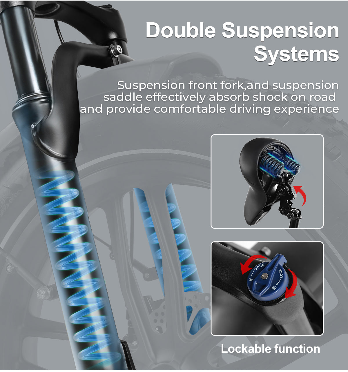 Durch die Verwendung einer verstellbaren und steiferen Gabel können unsere Fahrräder zur Stoßdämpfung auf unebenen Straßen entriegelt und für eine stabile Fahrt auf ebenem Untergrund verriegelt werden.