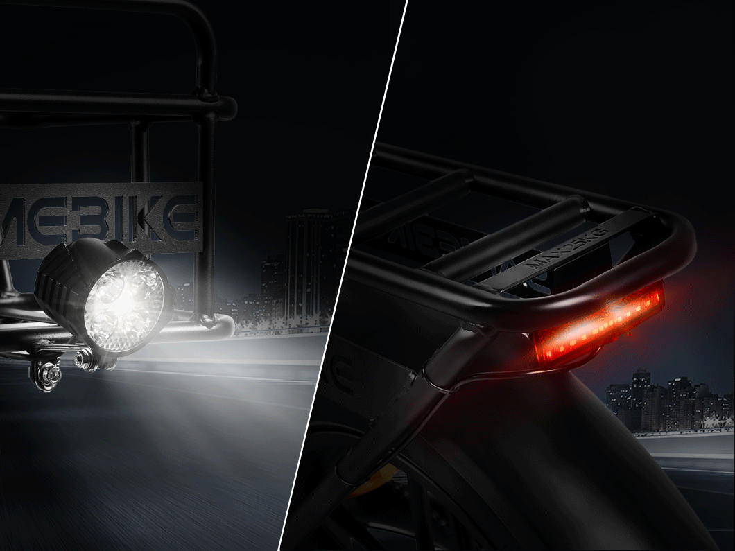 Ausgestattet mit doppelten LED-Leuchten vorne und hinten sorgt unser Fahrrad sowohl bei Tagesfahrten als auch bei nächtlichen Abenteuern für Sicherheit. Diese Lichter dienen nicht nur der Sichtbarkeit bei täglichen Inspektionen, sondern beleuchten auch Ihren Weg für sichereres Fahren bei Nacht.